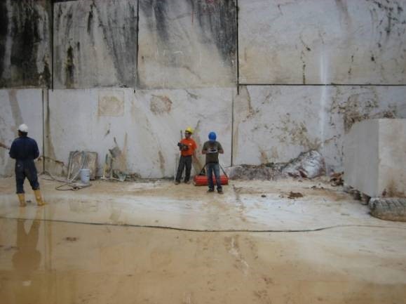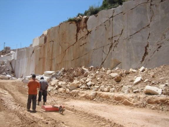 In this quarry a marble material whose marketing name is Emperor Marble is mined. Its petrography classification is a sparitic dolomite (dolosparite). During the geological survey of the quarry, it was observed that in the area of the quarry karts formations (cavities) have been developed, in general along pre-existing fractures and usually filled by clays.
